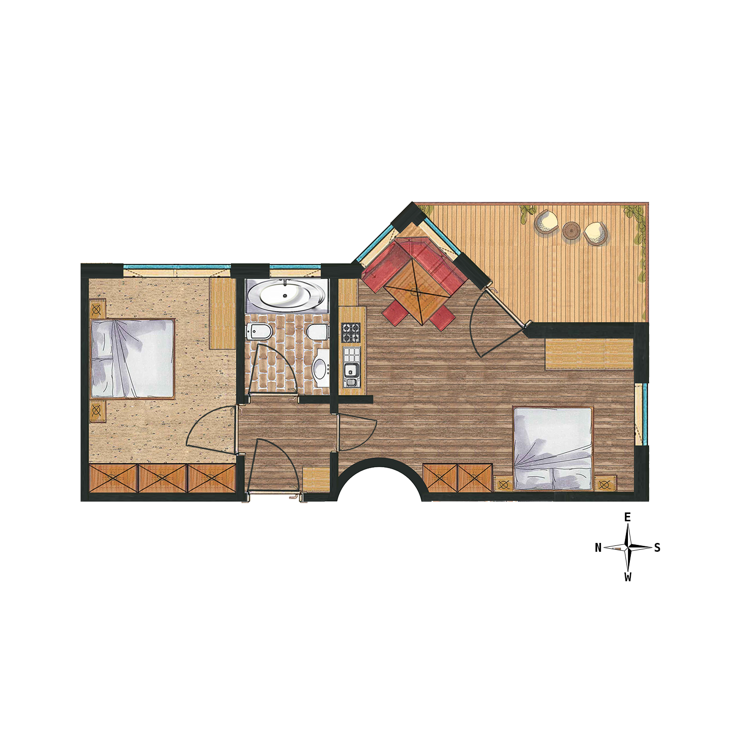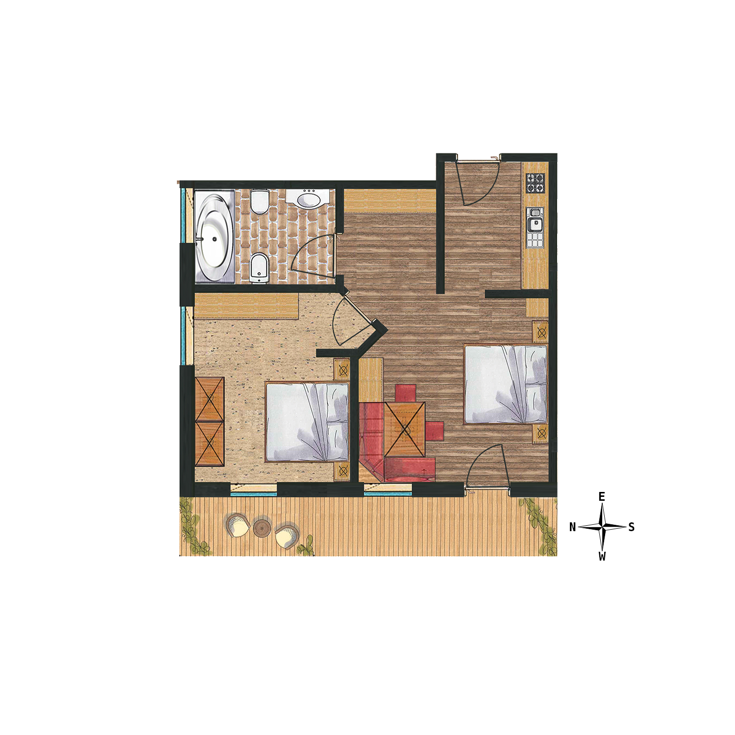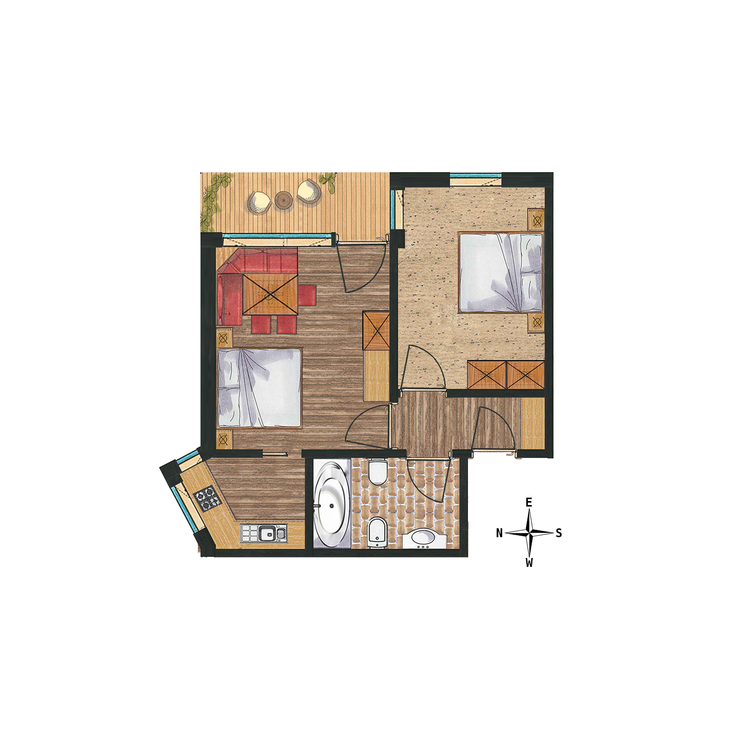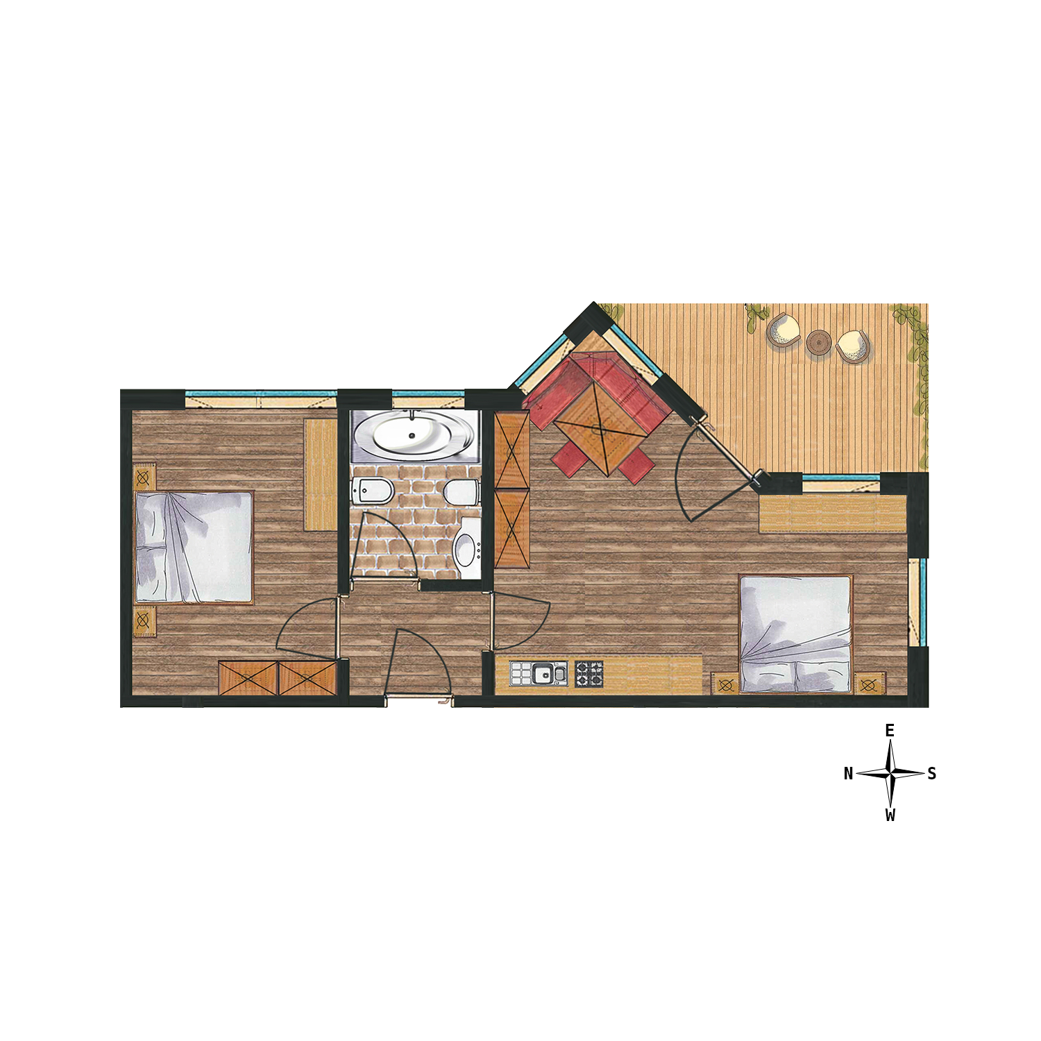Large and spacious: our apartments for four persons have a large main bedroom and a sofa-bed in the lounge with an integrated kitchen. The bathroom is again large and there is a shower incorporated in the bath and all floors are in wood.