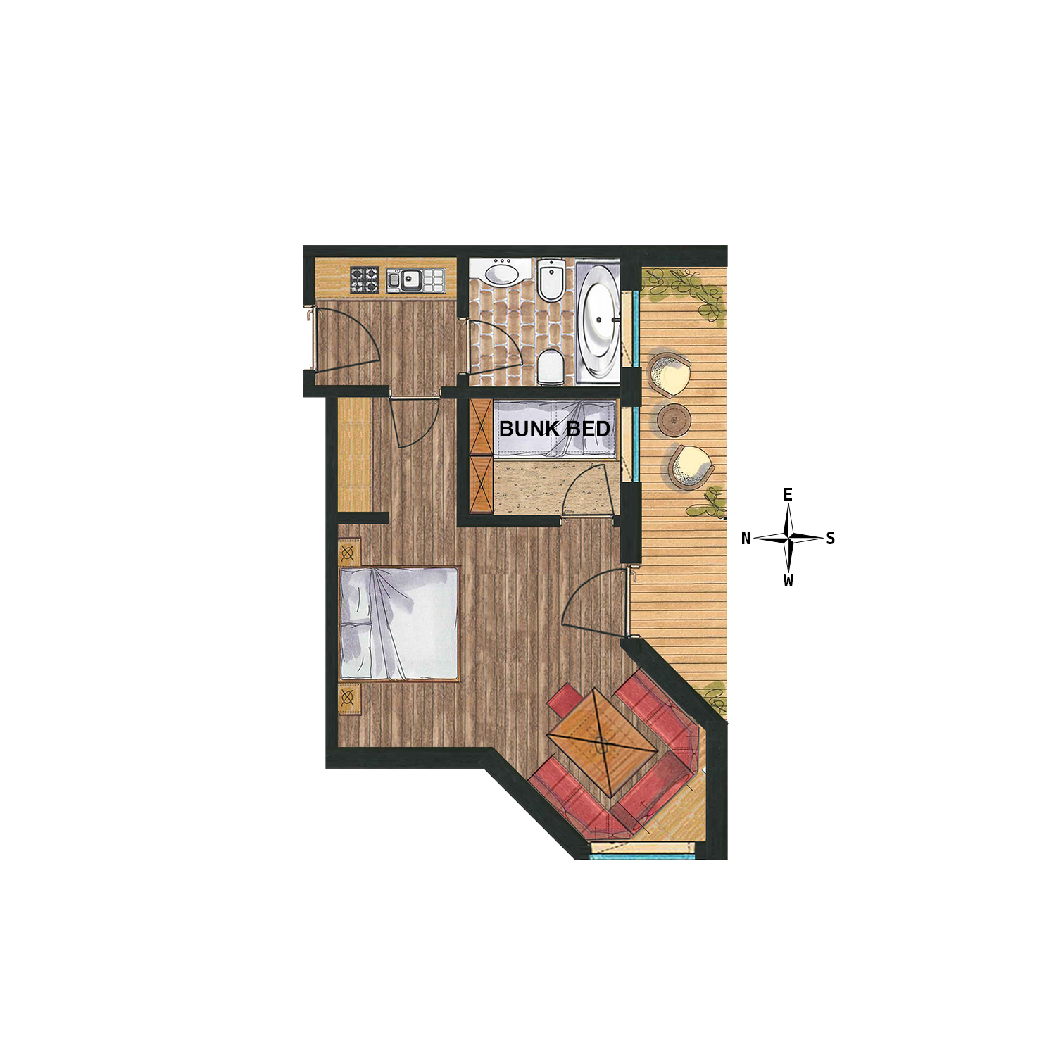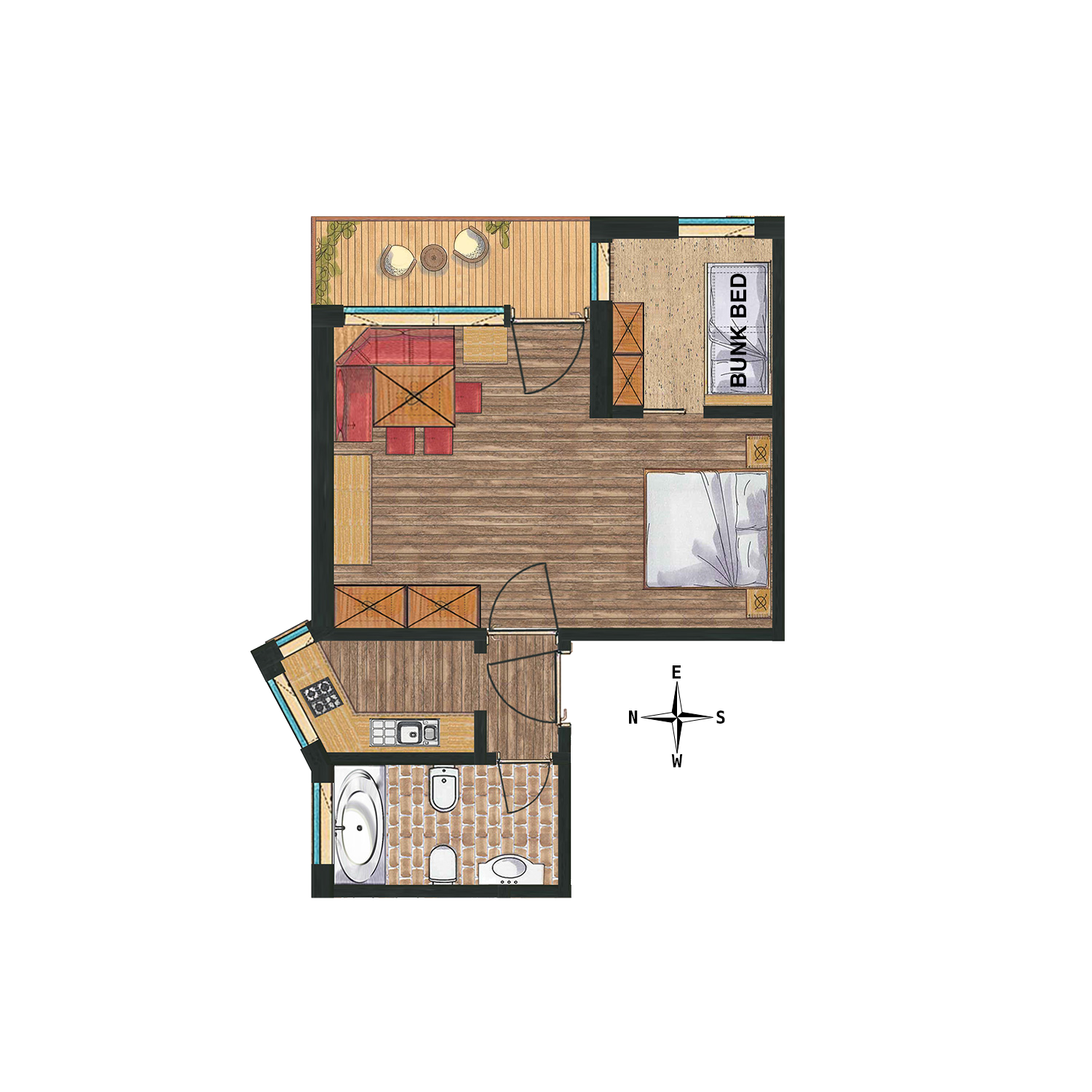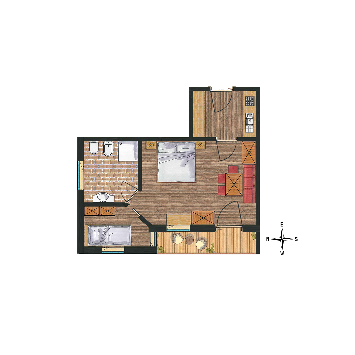 I nostri appartamenti per tre o quattro persone sono composti da soggiorno con letto fisso, camera con letto singolo o a castello, bagno con doccia o vasca, pavimento in legno e cucina separata, balcone privato o terrazzo. Armonia, sobrietà, eleganza rendono questi ambienti unici per vivere nelle Dolomiti giornate fantastiche.